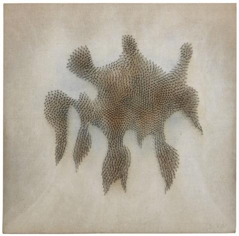 Hommage à Paul Scheerbart ("Scheerbartwesen"), Späte 1960er Jahre Nägel und weiße Farbe auf Rupfen, auf Holz